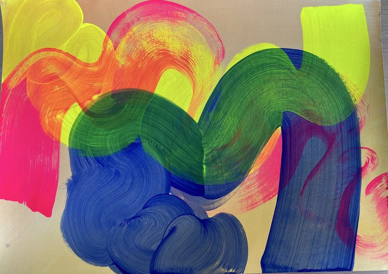 My process is both an escape and an immersion; it offers relief from the demands of daily life, particularly the labour-intensive reality of parenting small children, while also being influenced by the vibrancy of that world. The bright, playful colours and fluid forms echo the visual language of picture books and childhood joy, yet they also represent something more to me—the innate pleasure of making.