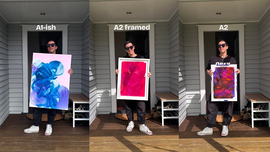My preference for the large original works is to always sell these either mounted onto an MDF box board or framed professionally in a floating style. For the box board, these are made by Frames by Daniel - I get them made slightly smaller in order to have wiggle room during the mounting process, so the final result is 880 x 620mm. When framing, the floating frame is best practice for original works on paper, and it looks tres chic, the final dimensions end up being 720 x 530mm.